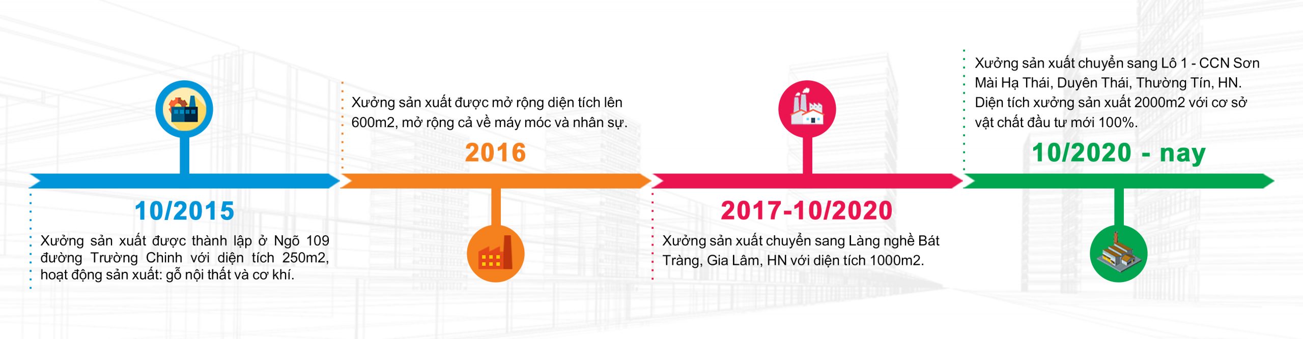 Trải qua gần 6 năm hình thành và phát triển, xưởng sản xuất nhỏ với quy mô 250m2 và 12 nhân viên đã được nâng cấp thành nhà máy với quy mô lên tới 2000m2, trang bị nhiều máy móc hiện đại để đáp ứng nhu cầu sản xuất, kinh doanh của Công ty.  Cho tới thời điểm hiện tại, đã có hàng chục ngàn sản phẩm và công trình được chúng tôi hoàn thiện.